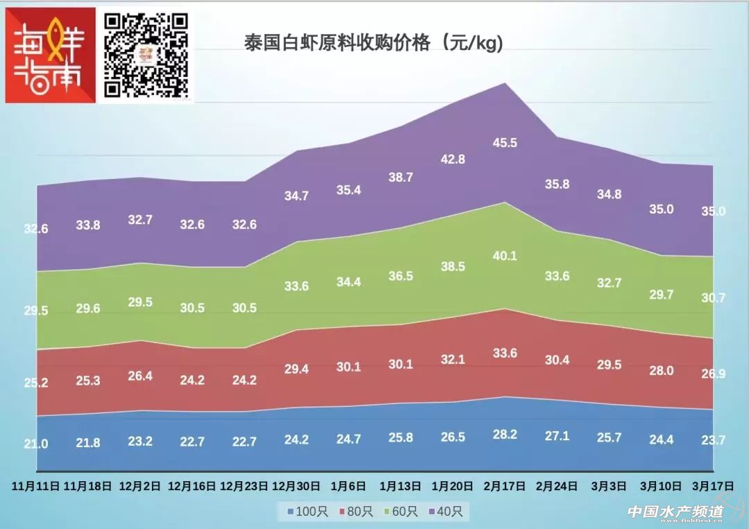 從下圖可以看出,泰國原料蝦價普遍繼續下行。3月17日,100只/kg原料蝦降幅為0.7元/kg,80只/kg降幅達1.1元/kg,60只/kg止跌回升,漲幅為1元/kg、40只/kg與上周持平。