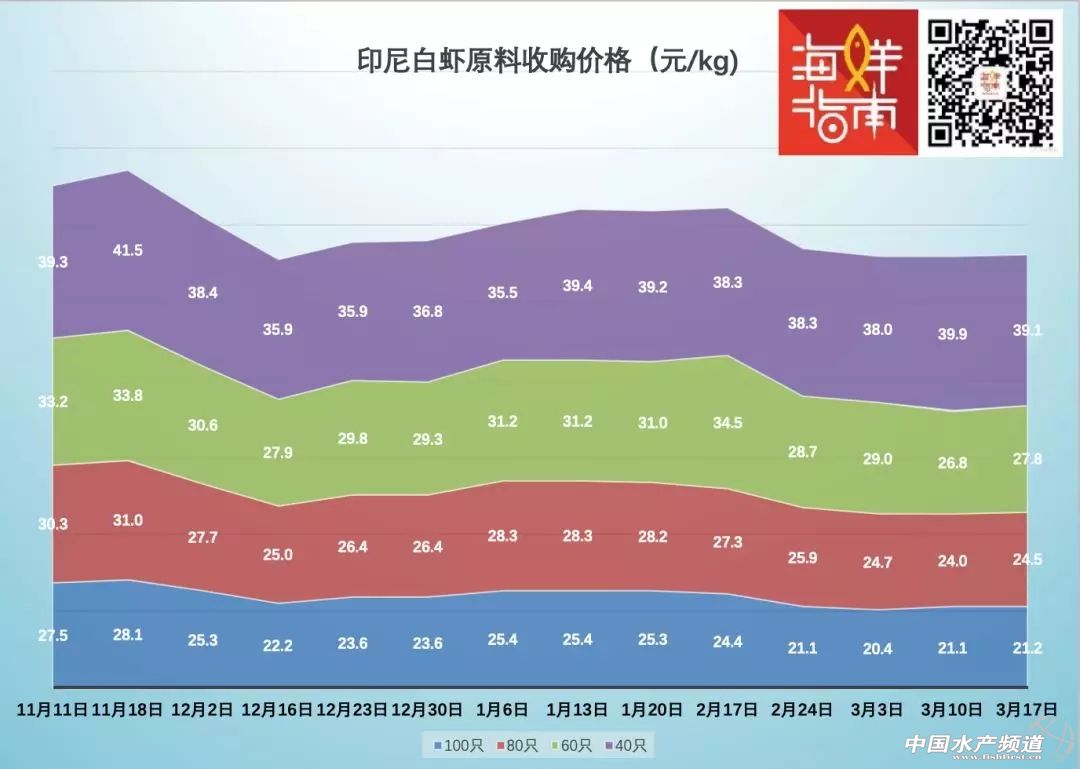 3月17日,從下圖可以看出,印尼白蝦收購價相對堅挺。其中,80只/kg原料蝦漲幅為0.5元/kg,60只/kg漲幅為1元/kg,但40只/kg降幅為0.8元/kg。