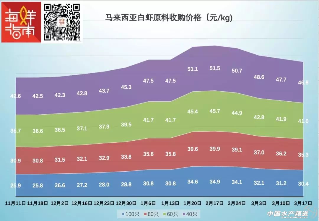 3月17日,如下圖所示,馬來西亞白蝦原料繼續下跌,平均降幅在0.9元/kg。