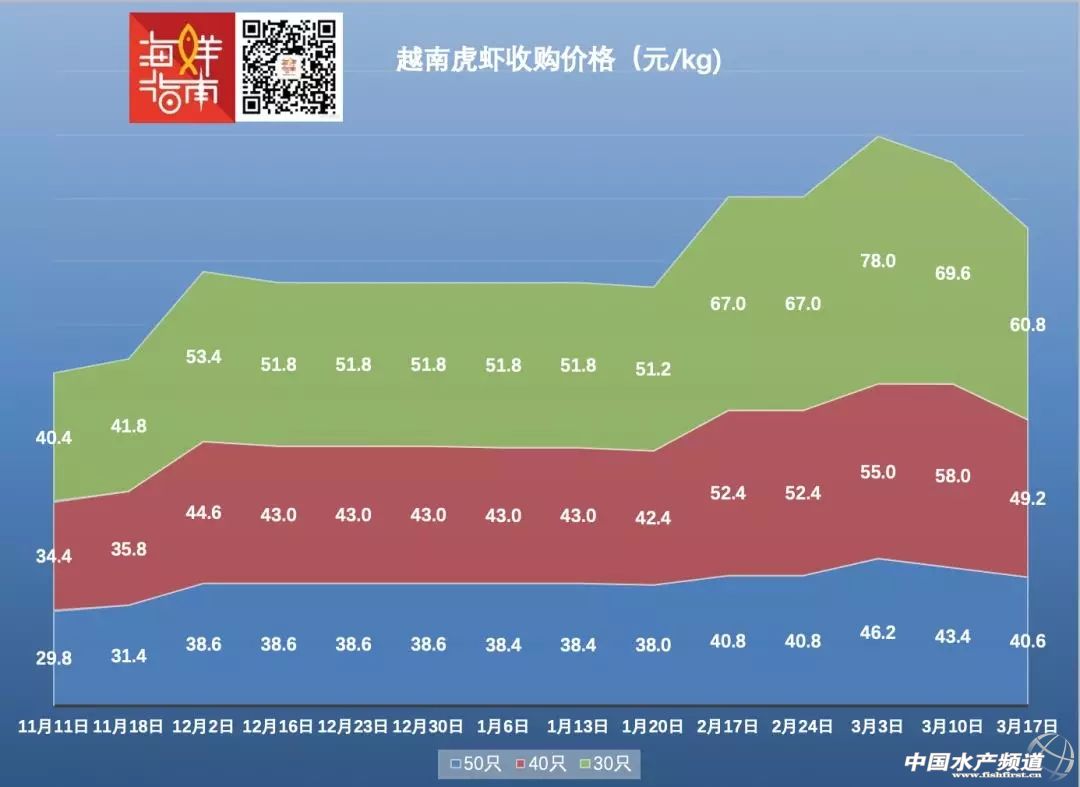 其中,30只/kg的越南虎蝦收購價每公斤降幅達8.8元;40只/kg降幅同樣為8.8元/kg,50只/kg降幅為2.8元/kg。
