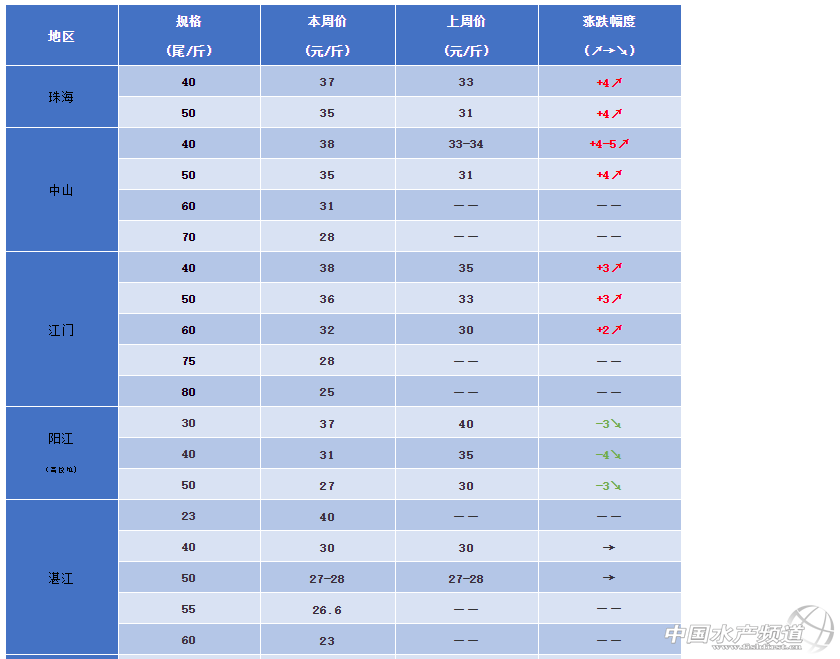珠海:本周蝦價40條37元/斤,50條35元/斤。珠海地區(qū)對蝦存量已經(jīng)非常少。