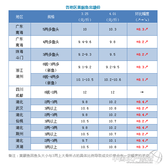 1、由于廣東黃顙魚現在貨源越來越緊張,本周價格與上周相比,不同規格的價格都上漲了0.2-0.3元/斤,5兩多魚頭價格在10.3元/斤,其他規格也上漲了0.2元/斤,本周銷量也比上周大,貨源有點緊張,因為外省的存塘量也少了,現在更多外省水車過來廣東拉魚回本地銷售了。接下來價格還會有上漲空間,銷量繼續上漲。