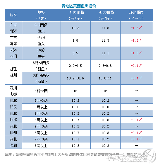 3、四川成都黃顙魚本周價格與上周一樣,還是12元/斤,銷量平穩(wěn);湖北各產(chǎn)區(qū)價格本周由于市場行情好,銷量上升,價格也有0.1元/斤的微調(diào)。
