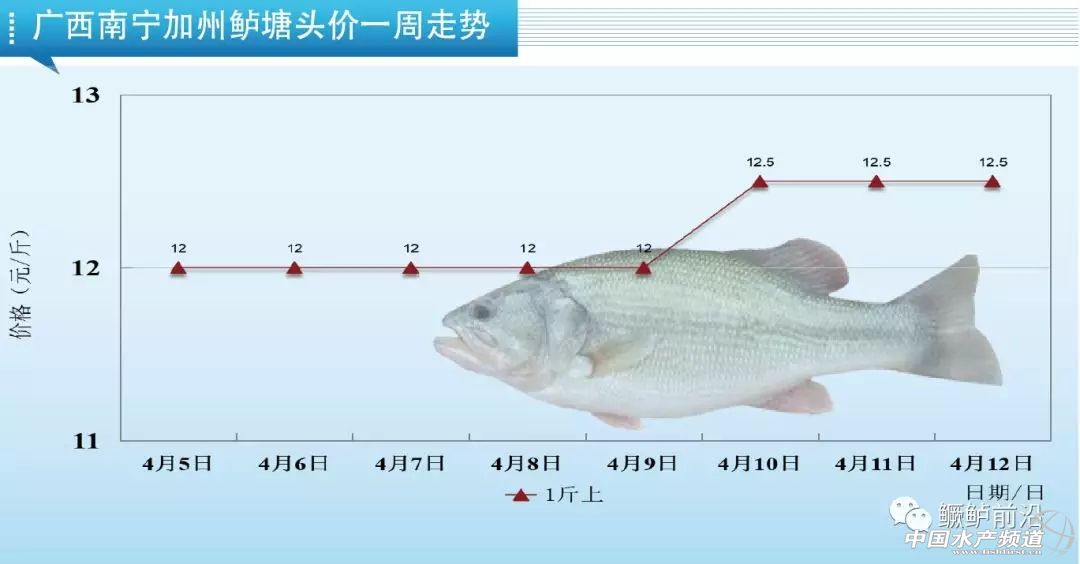 受廣東魚價上漲影響,本周南寧魚價上漲了0.5元/斤,今天1斤上報價12-12.5元/斤。目前南寧本地存塘魚達上市規格的較少,流通商多到廣東地區拉魚。