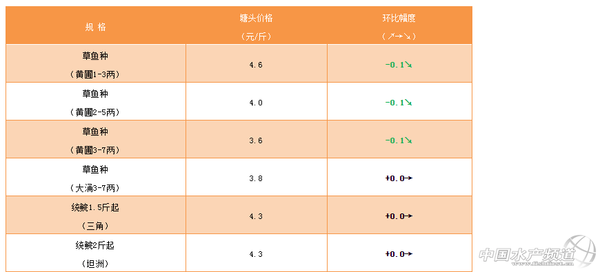 中國水產頻道原創報道,草魚種價格小幅度下滑,持續低迷,流通慢,市場存塘量大;統鯇和大草魚的價格穩定,市場存塘量大,短時間內難以回升;脆肉鯇價格平穩,波動不大。