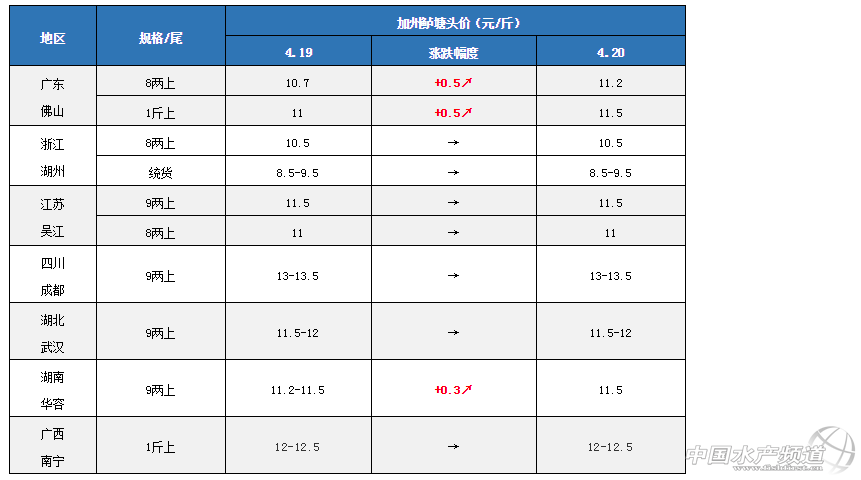除了廣東,今天湖南華容鱸魚也有所上漲,9兩上報價11.5元/斤,相比昨日價格11.2-11.5元/斤漲了0.3元/斤,當地存塘大規格魚也不多,養戶觀望等價,想養大規格來提高產量和效益;其他產區魚價基本持穩。