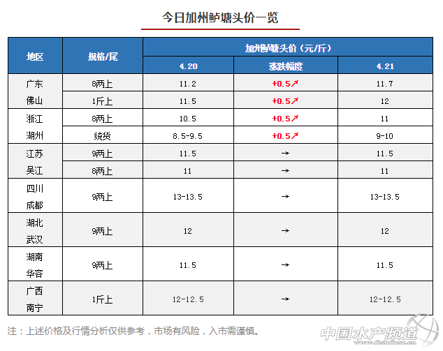 4月以來,廣東加州鱸塘頭價已經4次上調,目前8兩上魚價相比月初價格9.8元/斤上漲了1.9元/斤。據悉,目前佛山存塘大規格魚不多,市場上大魚缺得厲害,而現在大部分鱸魚產卵后體重下降嚴重,養戶認為目前賣魚并不劃算,出魚意愿不高,收購商為刺激養戶出魚以滿足訂單需求而上調了魚價,但養戶惜售心理依然較強。