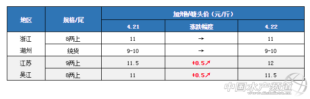浙江湖州:今天湖州8兩上報價11元/斤,統貨9-10元/斤,目前當地鱸魚存塘已經不多,預計隨著存塘逐漸減少和五一節日臨近,后市還有一定上漲空間。