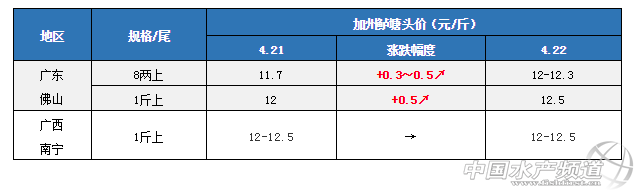 據悉,目前佛山存塘大規格魚不多,市場上大魚緊缺,加上現在大部分鱸魚產卵后體重下降嚴重,養戶出魚意愿不高,收購商因而幾次上調了魚價,但養戶惜售心理依然很強。一方面是部分養戶存在“賣跌不賣漲”心理;另一方面,臨近五一黃金周,部分養戶認為魚價還有上漲空間,因而觀望等價。