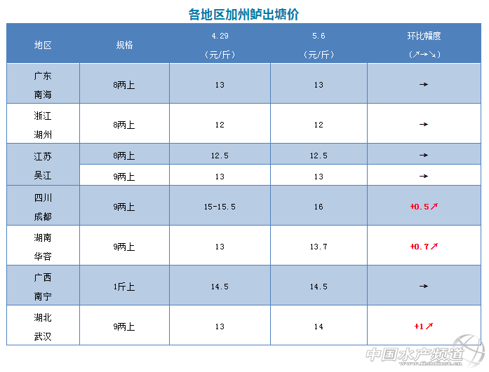 本周全國加州鱸價格除了四川成都、湖南貨容、湖北武漢比上周價格有0.5-1元/斤的漲幅外,其他產區價格與上周一樣。