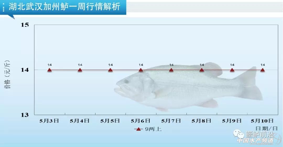 本周武漢鱸魚價格持穩,9兩上報價14元/斤左右。目前湖北市場鱸魚緊缺,預計后市看漲。