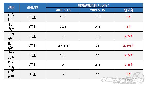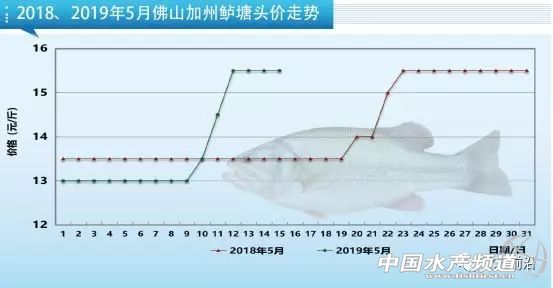 從上圖可以看出,去年同期佛山8兩上加州鱸報價13.5元/斤,目前價格同比去年高1.5-2元/斤。現在佛山順德區域大部分養戶已經清塘,存魚較少;南海沙頭區域存塘量還有8成左右,但當地習慣養舊魚模式,養戶出魚意愿一般。由于市場大規格魚緊缺,收購商為刺激養戶出多次上調了魚價以滿足訂單需求。