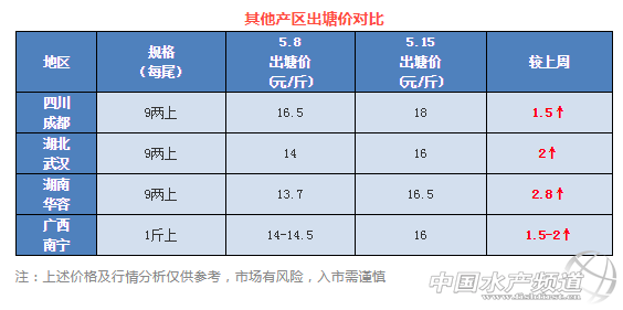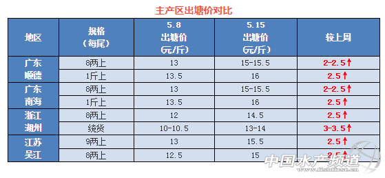 浙江湖州:今天報價8兩上14.5元/斤,相比上周價格上漲了2.5元/斤;統貨報價13-14/斤,比上周價格漲了3-3.5元/斤。隨著標魚價格上漲,近期湖州地區統貨價格也跟漲,預計5月中下旬價格預計將較為平穩,不會有太大的波動。