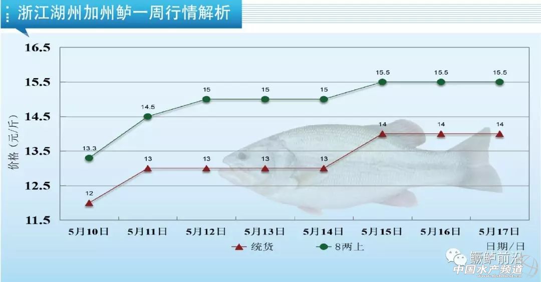 本周湖州魚價(jià)波動(dòng)上漲,今天8兩上報(bào)價(jià)15-15.5元/斤,統(tǒng)貨13-14元/斤,各規(guī)格相比上周上漲了2元/斤。湖州當(dāng)?shù)卮嫣流|魚已經(jīng)不多,流通商多到周邊吳江地區(qū)拉魚。