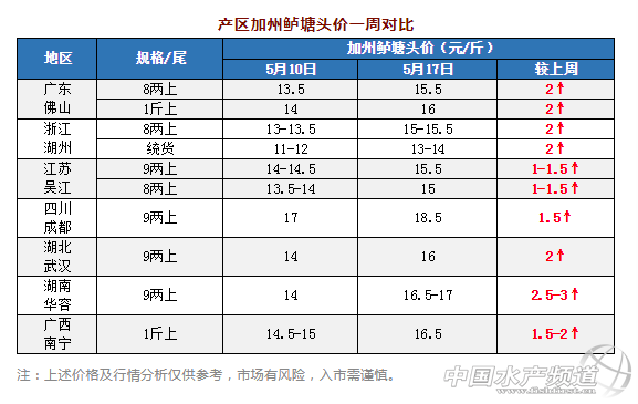 近段時(shí)間,加州鱸塘頭價(jià)漲勢(shì)可謂是猛如虎。受存塘大規(guī)格魚減少影響,本周各產(chǎn)區(qū)加州鱸塘頭價(jià)全線飄紅,漲幅達(dá)1.5-3元/斤不等。