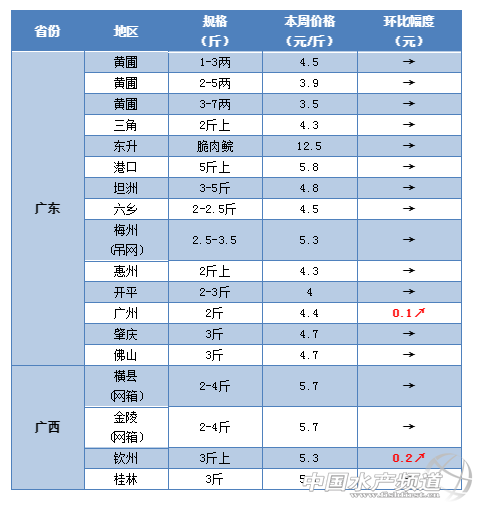 廣州:最近廣州地區的草魚塘頭價還是沒有太大變化,部分地區市場價格有所好轉。有流通商表示,目前廣州市場上草魚報價較之前微漲0.2元/斤左右。