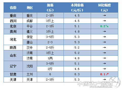 本周華東地區的草魚整體行情還是沒有明顯好轉,大部分地區塘頭價還是維持上周水平,個別地區因魚病導致價格出現小幅下滑。這幾天福建地區草魚流通不快,目前閩江地區3斤的草魚最新塘頭價還是維持在5.5元/斤,三明地區報價5.6元/斤,南平地區報價5.3-5.5元/斤,基本都還是維持上周水平。最近浙江地區的草魚整體銷量不大,目前衢州地區4斤以上的草魚塘頭賣4.9元/斤要的老板還不多,2.5-3斤的賣4.7元/斤。近期江蘇地區鯽魚發病比較嚴重,草魚行情也是受到一定的影響,部分地區價格出現小幅下滑,泰州地區1.8-2.3斤的草魚塘頭賣4.4元/斤,5斤以上的賣4.9元/斤。