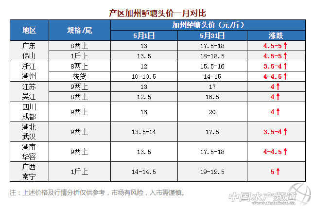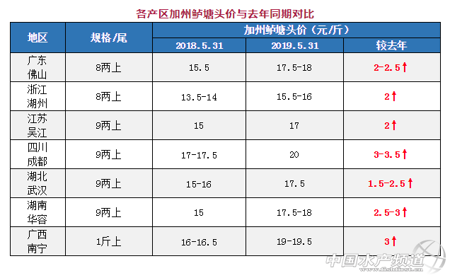 5月,受大規(guī)格魚緊缺影響,全國(guó)加州鱸塘頭價(jià)像“坐火箭”般猛漲,漲幅高達(dá)3.5-5元/斤不等。令業(yè)者更驚喜的是,目前各產(chǎn)區(qū)魚價(jià)相比去年同期高出了1.5-3元/斤不等,廣東、廣西、四川等產(chǎn)區(qū)魚價(jià)甚至已經(jīng)趕超去年最高價(jià)。