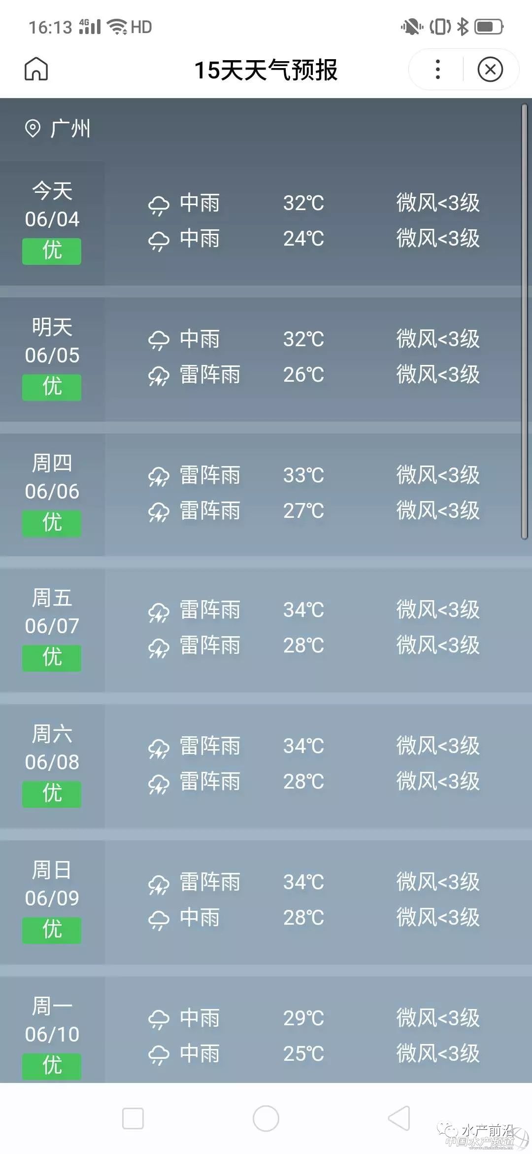 據中央氣象臺消息,6月4日夜間至6日,南方地區將自西向東、自北向南出現強降雨過程。從朋友圈了解到,目前珠三角地區正雷雨不斷,廣東中山地區有部分街道已經被完全淹沒,大家要注意出行安全。暴雨天氣也是導致了出魚的難度,本周華南地區的草魚行情整體繼續保持平穩,目前的塘頭價還是沒有明顯變化。據了解,目前中山地區的草魚行情微漲,成魚價格維持在4.8元/斤左右;江門地區草魚存塘還是比較多,近期行情相對低迷。不過大家對于節日的行情還是抱樂觀態度,大部分養殖戶表示端午節草魚行情應該會漲。