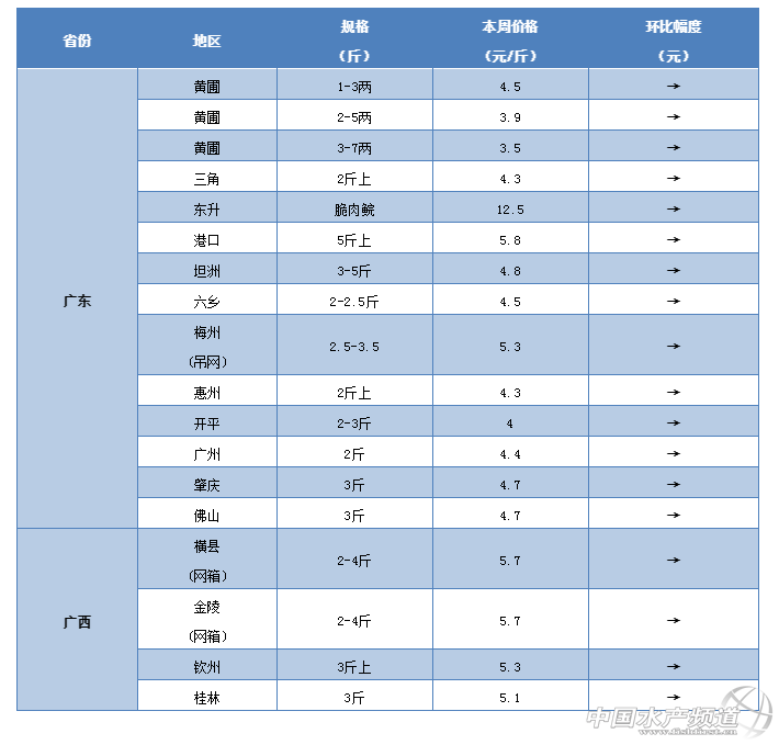 梅州:據業內人士介紹,目前梅州地區的草魚價格受到豬肉漲價的影響還不是很明顯,草魚最新塘頭價還是維持在5-5.3元/斤。