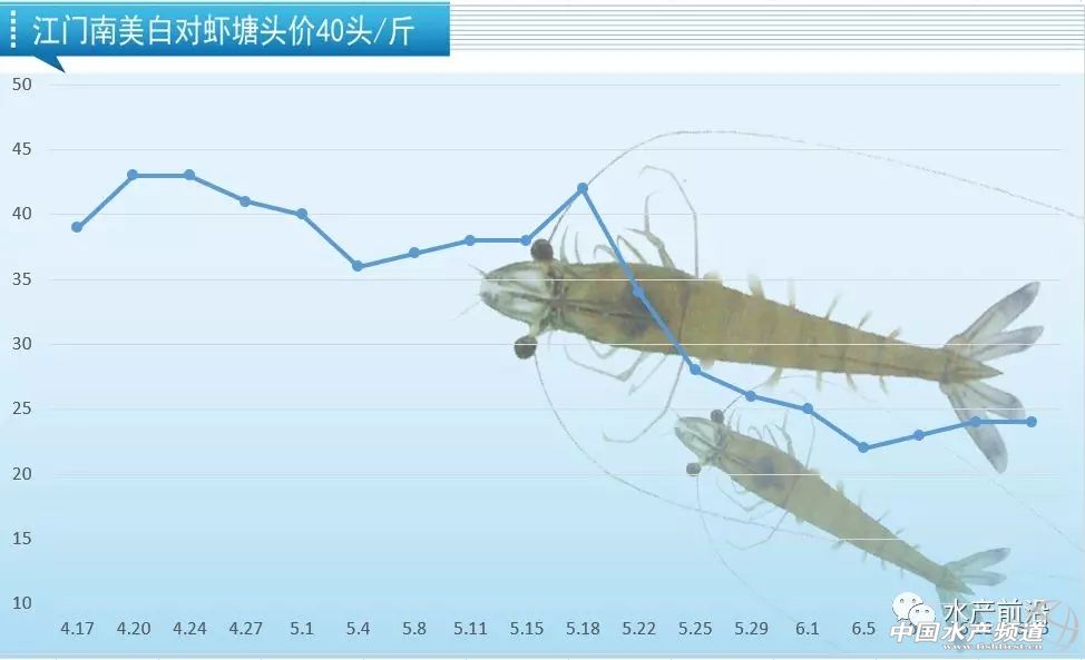 江門:40條24元/斤,50條21元/斤,60條18元/斤。本周江門地區白蝦塘頭價維持穩定,40條蝦對比上周同期漲1元/斤。