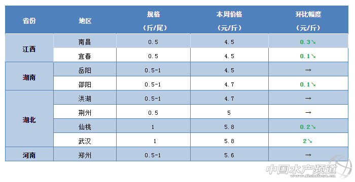 在上周短暫上漲之后,本周華中地區(qū)的江西、湖南、湖北有多個地區(qū)鯽魚價格再次出現(xiàn)下滑。其中,湖北武漢地區(qū)下滑最為明顯。據(jù)養(yǎng)殖戶介紹,最近武漢白沙洲市場的鯽魚行情較之前下滑了1.5-2.2元/斤,目前8兩到1斤的鯽魚大多賣6.5元/斤。而且草魚也是還是很爛市,經(jīng)常會有江西的草魚賣到湖北只賣2.8-3.3元/斤,嚴重擾亂市場行情。目前湖北隨州、荊州等地區(qū)的鯽魚行情還是繼續(xù)保持穩(wěn)定,價格沒有明顯變化。最近江西地區(qū)的鯽魚塘頭價較上周也是下滑了0.1-0.3元/斤,有南昌養(yǎng)殖戶表示欲哭無淚。本周湖南常德地區(qū)的鯽魚行情整體上變化不大,有個別地區(qū)有下滑趨勢。