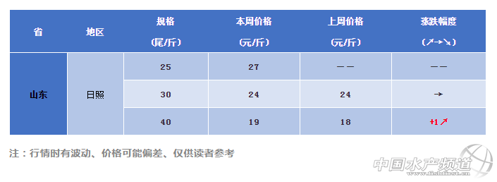 山東日照:25條27元/斤,30條24元/斤,40條19元/斤。本周山東地區蝦價維持穩定。交易量一般,整體行情弱勢,養殖情況正常。