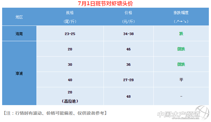 本周各地斑節蝦價格有略微下滑。福建地區高位池抓蝦逐漸增多,高位池大規格斑節蝦比土塘同規格蝦高出1元/斤至2元/斤。