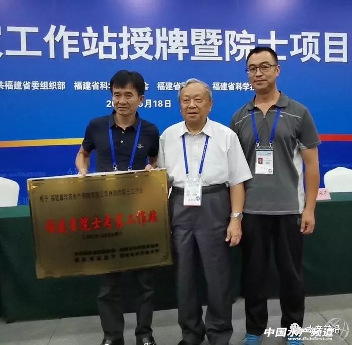 福建省院士專家工作站授牌儀式合影(左:鑫洋賓公司董事長 楊國賓 中:中山大學林浩然院士 右:黃海水產研究所 梁友)