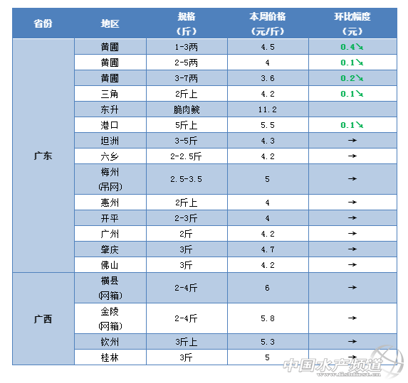 廣西:本周廣西地區的草魚塘頭價整體還是保持穩定,部分地區有小幅下滑。從養殖戶了解到,目前貴港地區3斤的草魚塘頭賣5.2元/斤,較上周回落0.3元/斤;來賓、桂林、南寧等地區最新塘頭價維持在5元/斤左右,基本維持上周水平。