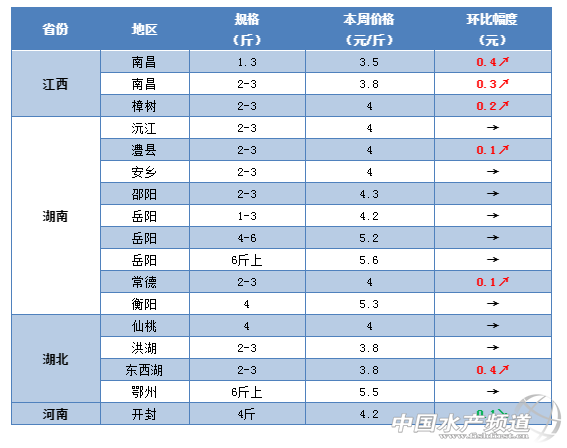 河南:本周河南地區的草魚行情也不是很好,部分地區有小幅下滑。據養殖戶介紹,目前開封地區4斤以下的草魚塘頭價賣4.1-4.2元/斤,4斤以上的賣4.4-4.5元/斤。