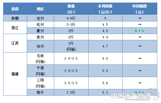 本周華東地區的草魚行情整體上還是變化不大,受到鯽魚上漲的拉動江蘇部分地區的草魚行情開始略有好轉,安徽、浙江、上海、福建等地的草魚最新塘頭價暫時沒有明顯變化。