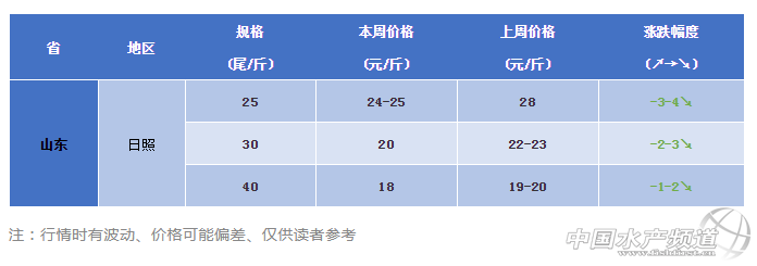 山東日照:25條24-25元/斤,30條20元/斤,40條18元/斤。本周山東地區蝦價再度下滑,跌幅達到4元/斤,目前主要以外塘蝦為主,大蝦較少。