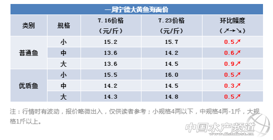 本周寧德大黃魚價格全面上漲,其中小規格魚依然走俏,品相較好的優質魚已經突破16元關口。而中規格魚漲幅在0.5元左右,老瓜漲幅最大,從上周的13.6元回到14.5高價位。