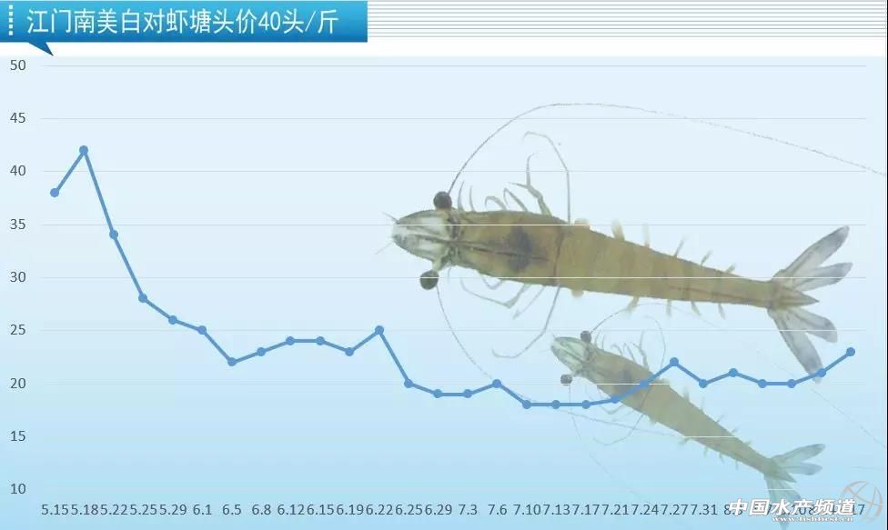 陽江:30條22元/斤,40條19元/斤,60條15元/斤。本周陽江地區蝦價較上周有小幅上漲的趨勢,現在陽江平崗地區進入尾造蝦,規格較小;中造還有存塘大蝦的約有兩成養殖戶。近期持續的高溫暴雨天氣,偷死、藍藻、白便問題較多,養殖難度較大。