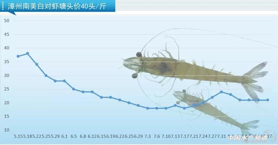 湛江:高位池:40條19元/斤,50條16元/斤,60條14元/斤。湛江地區本周持續低迷狀態,整體成功率不高,尤其是近期高溫天氣,白便偷死嚴重。50-70條規格的蝦價差別不多,一些量大的養殖戶都會隨價出蝦。