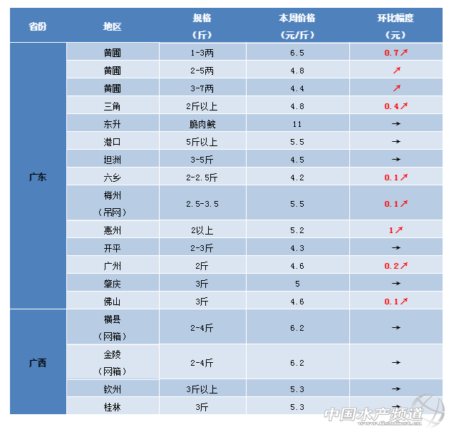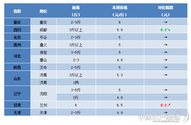 西北地區:本周西北地區的草魚行情較之前出現了小幅回升。從流通商了解到,目前甘肅蘭州市場草魚最新報價從之前的6.-6.3元/斤上漲到了6.5元/斤,上漲了0.2-0.5元。