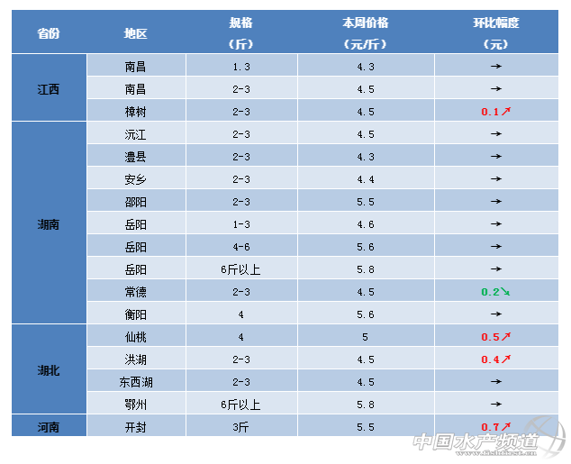 本周華中大部分地區草魚塘頭價還是沒有太大變化,最近兩天湖北和河南有個別地區草魚行情也是出現有上漲趨勢。據了解,目前湖北洪湖地區塘頭價已經賣到4.5元/斤,相比之前上漲了0.4元,武漢地區2斤的草魚市場基本可以賣到4.5元/斤;湖南長沙市場草魚最新報價基本維持在5元/斤左右,常德地區草魚塘頭起步價繼續保持在4.5元/斤;最近河南開封地區3斤的草魚塘頭價也已經漲到了5.5元/斤,上漲了0.7元/斤;江西南昌和樟樹地區2斤的草魚最新塘頭價還是維持在4.3-4.5元/斤。有新余養殖戶表示,目前當地市場上豬肉已經賣到21元/斤了,最近魚價也是開始出現上漲了,不知道今年的草魚能否回到曾經塘頭價7.2元/斤的高位。