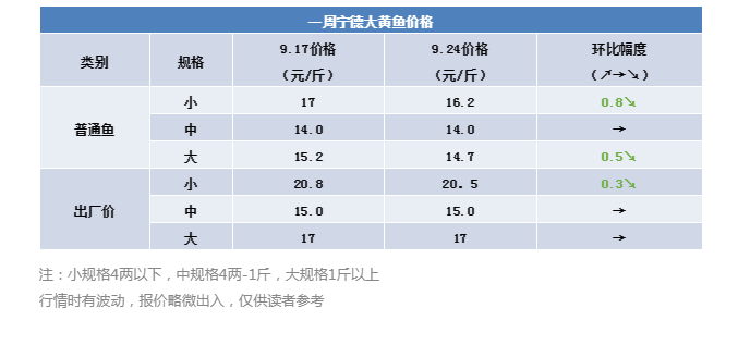 本周寧德大黃魚小規格與大規格暴跌,老瓜又跌回15元內,中規格魚價格保持穩定。小規格魚跌幅最大,幾乎達到1元/斤,業內人士分析,節后大黃魚價格回落屬于正常情況,跌幅還在養殖戶的預期之內,接下來就看國慶節是否能搏一搏高位,畢竟假期時間更長,來寧德霞浦觀光旅游的人數會更多,相應的刺激大黃魚消費。