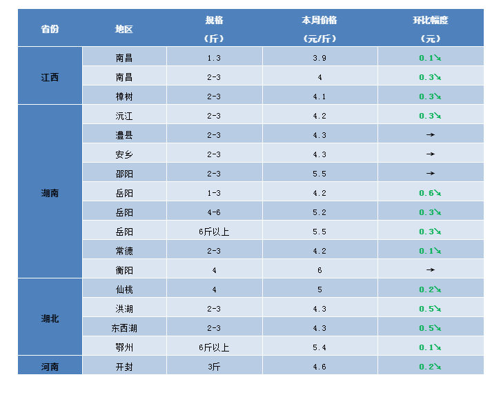 湖北:本周湖北地區草魚塘頭價相比上周也是出現明顯下滑。據了解,目前洪湖和東西湖地區2-3斤的草魚最新塘頭價跌倒4.3元/斤左右,下滑0.5元/斤;仙桃地區4斤以上的也只賣到5元/斤,下滑0.2元/斤;目前,隨州地區3斤以上的草魚塘頭價賣6.5元/斤,還是維持在上周水平,暫時沒有出現上漲。