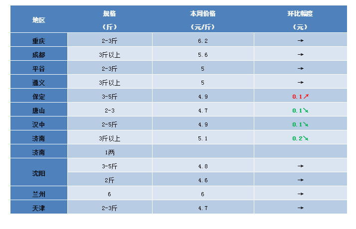 華北地區:本周華北地區草魚也是出現小幅下滑,整體行情變化不是很大。有唐山養殖戶反映,剛剛出的一塘3斤左右的草魚的塘頭賣4.7元/斤,相比上周下滑0.1元/斤。有山東養殖戶表示,現在價格不跌已經謝天謝地了,目前濟南地區草魚也是出現0.2元的下滑,3斤的草魚塘頭賣5.1元/斤左右。