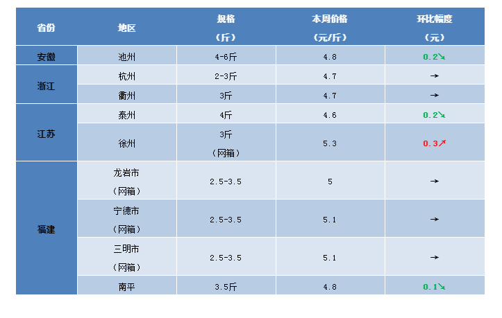 相比其他地區,本周華東地區草魚行雖然也是有所下滑,但是整體變化幅度不是很大。其中,江蘇地區有漲又跌,局部市場已經開始有好轉跡象;福建地區整體上維持上周水平,部分地區有0.1元左右的小幅下滑。