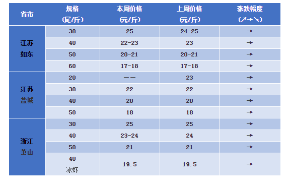 浙江蕭山:30條25元/斤,40條24元/斤,50條20-21元/斤。本周蕭山地區蝦價與上周持平,整體行情維穩。