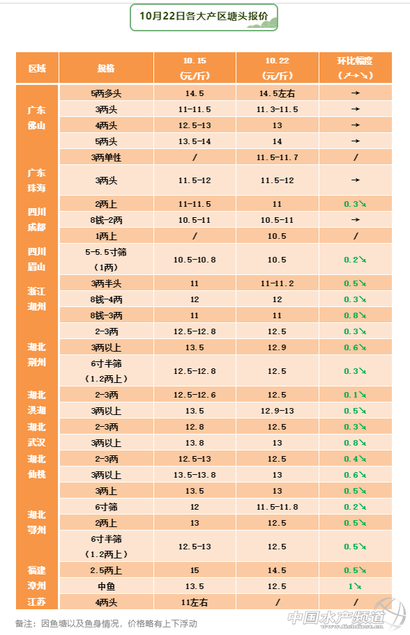 福建漳州,下跌1元/斤。本周漳州的中魚價(jià)格為12.5元/斤,下降比較明顯,新魚上市,有地魚走動對市場有所影響,2.5兩上塘頭收購價(jià)格為14.5元/斤,下跌0.5元/斤,市面上售價(jià)有所下跌只能把塘頭收購價(jià)往下壓一壓,出魚人不多,當(dāng)?shù)卮笠?guī)格存塘量不多。浙江湖州,本周價(jià)格相對比較穩(wěn)定,8錢-3兩價(jià)格目前保持在11元/斤左右,自從上次跌價(jià)之后價(jià)格平穩(wěn),走一部分外地市場,上漲的趨勢不明顯。
