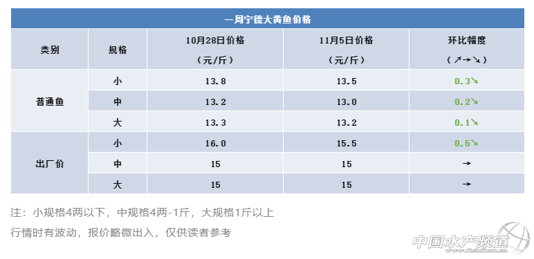 本周寧德大黃魚又呈現(xiàn)下跌趨勢,中規(guī)格魚每斤下跌0.2元,大規(guī)格下跌0.1元,但小規(guī)格跌幅達0.3元,加工廠報價更是下降0.5元/斤。