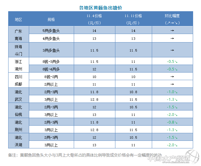 4、本周湖北各地區黃顙魚價格有0.8-2.0元/斤不等的跌幅,銷量與上周相比變化不大。