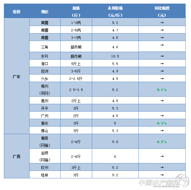 廣西:據了解,在環保壓力下最近廣西橫縣地區拆網箱導致草魚大量上市,部分地區草魚塘頭價有下滑趨勢。從養殖戶了解到,目前金陵部分地區3斤以上的網箱草魚最新塘頭價5.8元/斤,較之前下滑0.2元/斤;桂林地區3斤左右的草魚塘頭賣5.2-5.3元/斤,貴港地區3斤的草魚最新塘頭價5.2元/斤,基本保持穩定。