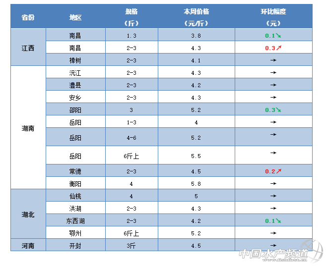 河南:本周河南地區的草魚行情沒有出現明顯波動,塘頭價基本維持上周水平。從養殖戶了解到,目前開封地區3斤的草魚最新塘頭價4.5-4.6元/斤,鄭州地區3-5斤的草魚塘頭賣4.5元/斤。