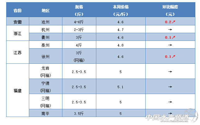 江蘇:本周江蘇地區的草魚行情整體上還是保持穩定,塘頭價暫時沒有出現太大的變化。據了解,目前徐州駱馬湖地區3斤左右的草魚塘頭賣4.5-4.7元/斤,最近行情基本保持穩定;泰州地區4斤的草魚最新塘頭價繼續維持在4.8元/斤左右。