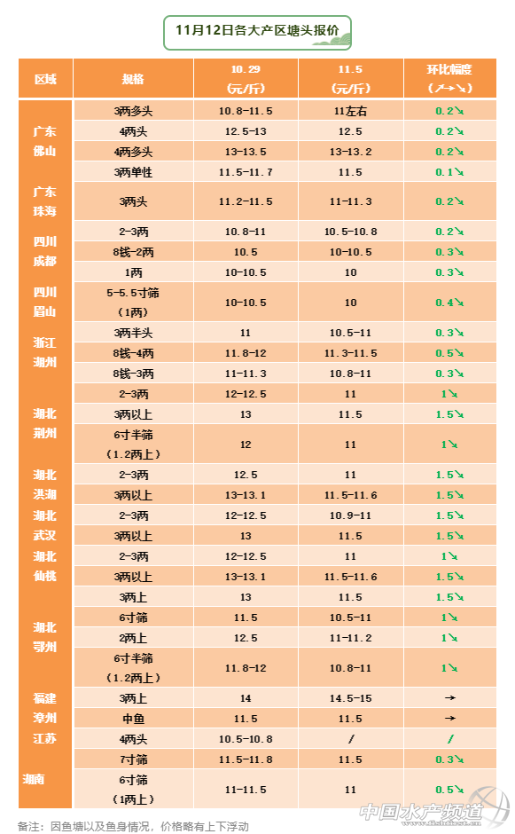 四川,本周下跌0.5元/斤。受新魚(yú)上市沖擊,同時(shí)當(dāng)前外地魚(yú)入川的量相對(duì)比較多,很多趕越冬前出魚(yú),市面上的魚(yú)出現(xiàn)短期的擁堵現(xiàn)象,5寸上篩價(jià)格僅為10元/斤左右,環(huán)比下跌了5毛錢(qián),5寸起含6寸及以上40%的10.5,有人認(rèn)為隨著水溫進(jìn)一步下降,當(dāng)?shù)睾罄m(xù)行情可能有所回升。據(jù)一業(yè)內(nèi)人員透露“現(xiàn)在市場(chǎng)上都是湖北大規(guī)格貨,本地小規(guī)格不好賣(mài),現(xiàn)在都不怎么喂料了,升價(jià)只能是等湖北下雪不好打魚(yú),路不走時(shí)候,本地才能出貨賣(mài),不然就等明年喂大點(diǎn)再賣(mài)”。